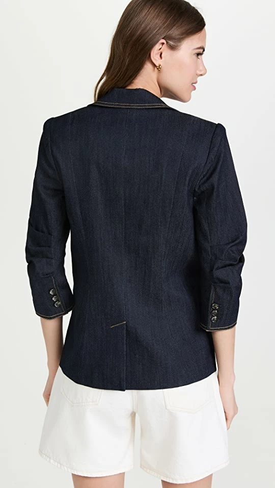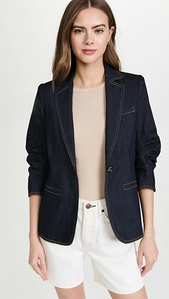 Splitting the difference between polished and casual, this sharply tailored blazer from Cinq a Sept is offered in crisp, dark denim. Round out your look with a simple tee and a light-colored pair of trousers or shorts.