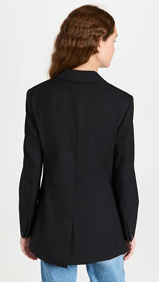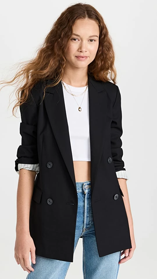 - Notched lapels and double-breasted button placket