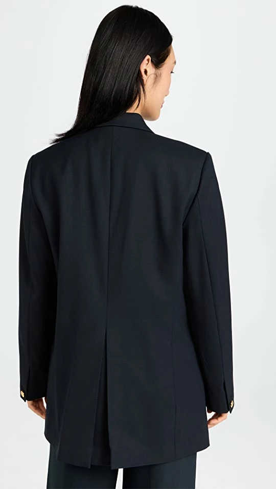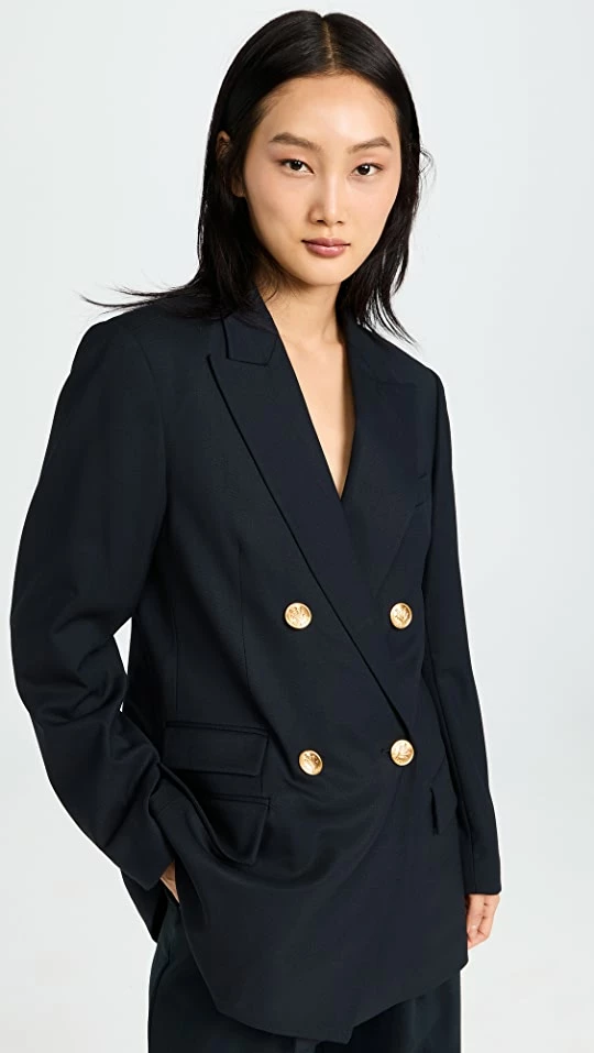 - Notched lapels and double-breasted button placket