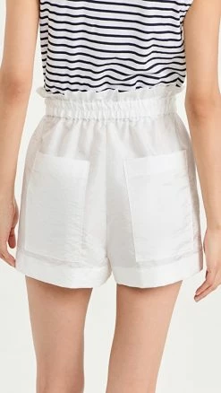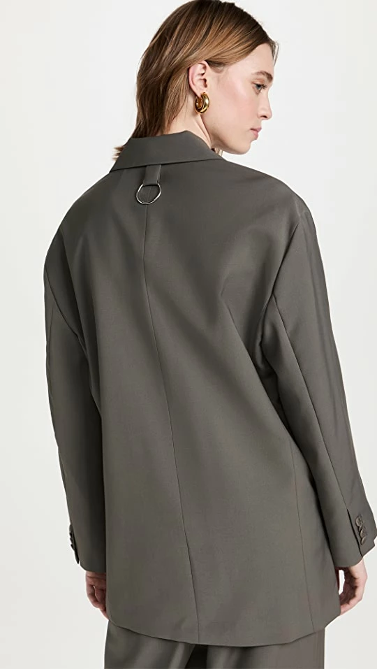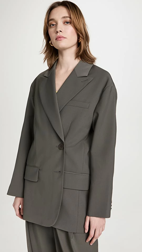- Double-breasted silhouette with button placket