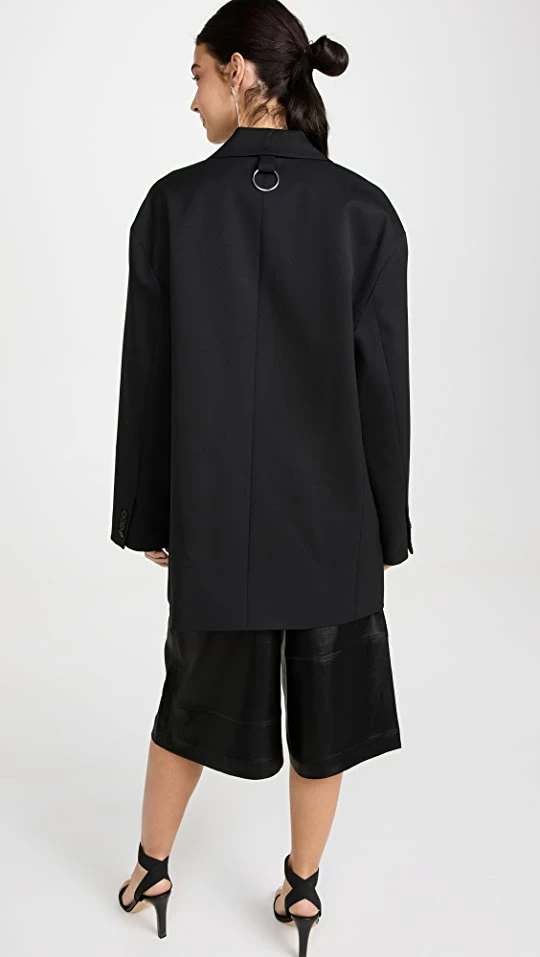 - Double-breasted silhouette with button placket