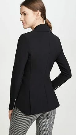- Peaked lapels and double-breasted button placket